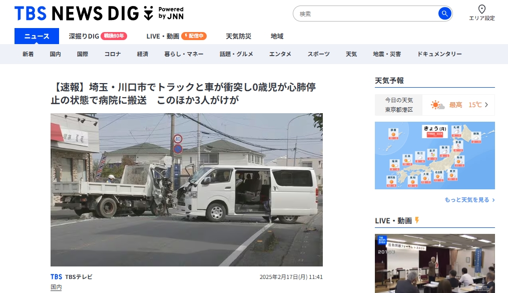 【速報】埼玉・川口市でトラックと車が衝突し0歳児が心肺停止の状態で病院に搬送