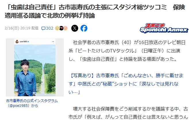 古市氏は「歯をちゃんと磨かなかったとか。北欧は基本的に医療費はほぼタダみたいなものだが歯は基本的に全額自己負担なんですね。これは理屈でいうと虫歯は自己責任だからっていう」と海外の実例を挙げ、「ブラッシングの仕組みをちゃんと身に付けて。だから18歳までは無料でいいと思うけどその間にちゃんと歯を磨く習慣を(身に付けさせる)」と話した。