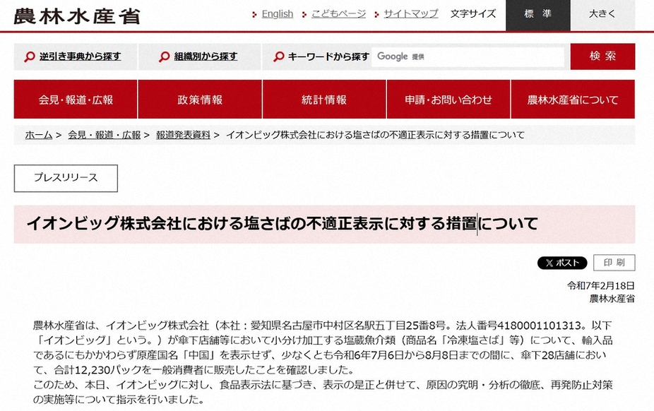 農水省は18日、「イオンビッグ株式会社における塩さばの不適正表示に対する措置について」のお知らせを発表。同社が、傘下店舗等において小分け加工する塩蔵魚介類(商品名「冷凍塩さば」等)について、輸入品であるにもかかわらず原産国名「中国」を表示せず、少なくとも昨年7月6日から8月8日までの間に、傘下28店舗において、合計1万2230パックを一般消費者に販売したことを確認したと発表した。