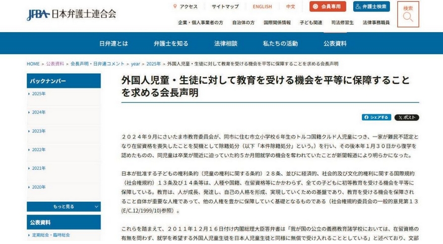 日本弁護士会の公式サイトで公表された会長声明女児は2022年に一家で来日し、難民申請し特定活動の在留資格を取得。小学校4年生に編入されたが、6年生の2024年7月に難民と認定されず在留資格を失った。