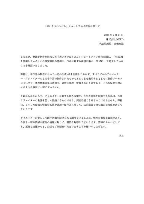 【画像】「赤いきつね」CMフェミ炎上騒動、発売元マルちゃんが静観する中アニメーション制作側がブチ切れお気持ち表明してしまうwwww