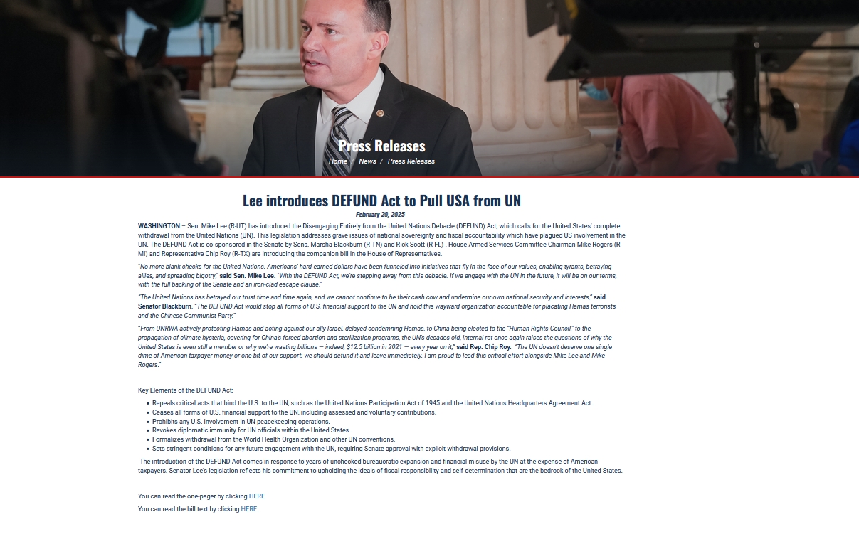【速報】米共和党議員のマイク上院議員が米国の国連脱退を要求 国連脱退法案を提出 キタ━━!