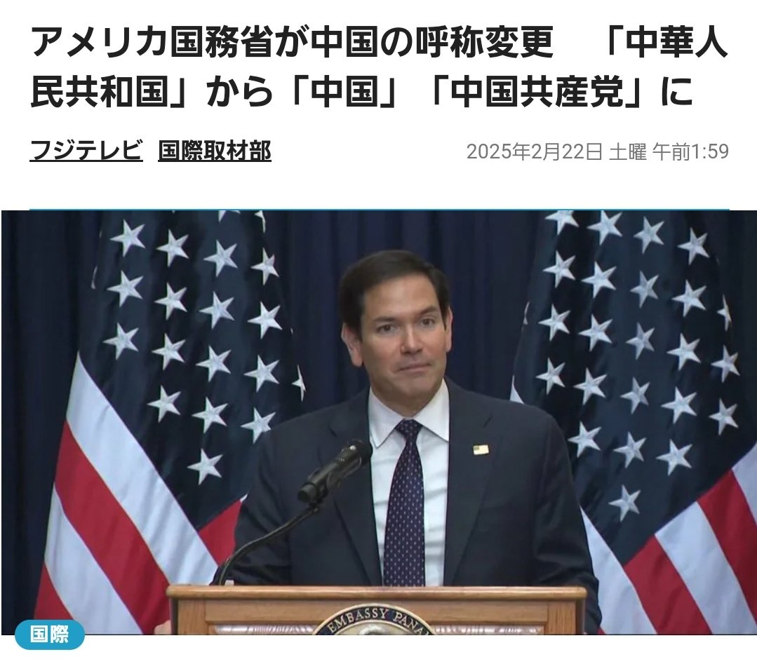 【速報】アメリカ国務省、中国の呼称変更「中華人民共和国」から「中国」と「中国共産党」 対中強硬派のルビオ国務長官の意向