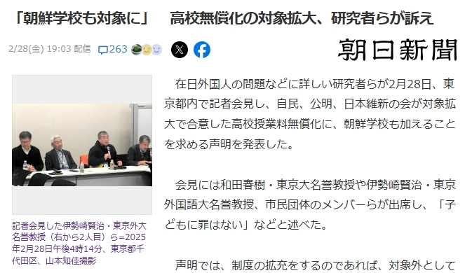 今国会で自民、公明、日本維新の会の3党が合意した高校授業料の無償化拡充に関し、全国の朝鮮学校が無償化から除外されたままなのは問題だとして、田中宏一橋大名誉教授ら学者や支援者が28日、国会内で記者会見を開き「子どもに罪はない。朝鮮学校排除をやめ、無償化対象に加えるべきだ」と主張した。