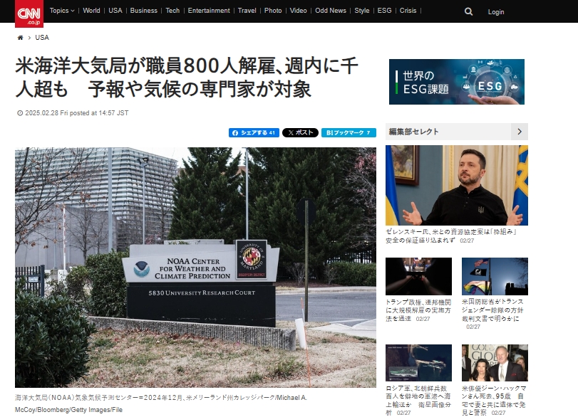 1: 名無し 2025/02/28(金) 18:50:41.51 ID:MsaugD880 BE:754019341-PLT(12346)米海洋大気局が職員800人解雇、週内に千人超も 予報や気候の専門家が対象トランプ米政権が連邦政府職員の削減を続ける中、海洋大気局(NOAA)の職員約800人が解雇された。関係者2人が明らかにした。