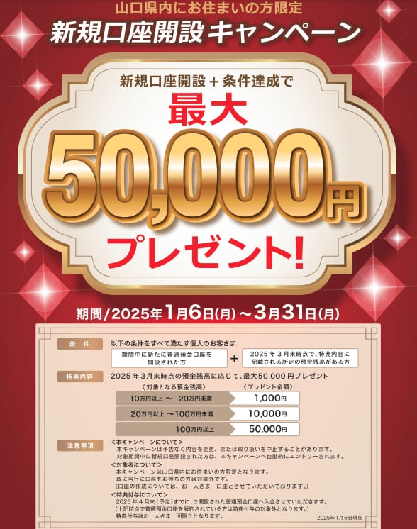 1月6日に始まったキャンペーンは、山口県在住者が新たに普通預金口座を開設し、3月末時点の残高を100万円以上にすれば、4月末までに最大5万円がもらえるという内容。