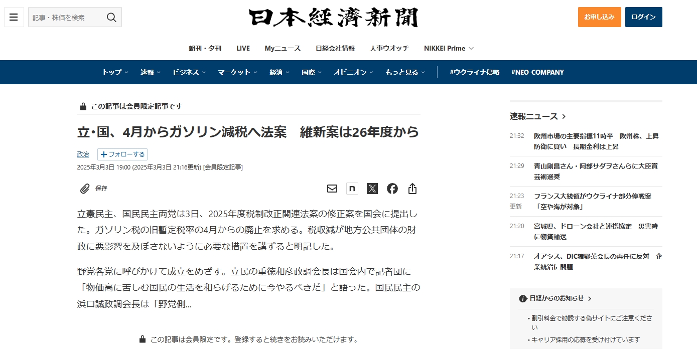 立憲民主、国民民主両党は3日、2025年度税制改正関連法案の修正案を国会に提出した。ガソリン税の旧暫定税率の4月からの廃止を求める。税収減が地方公共団体の財政に悪影響を及ぼさないように必要な措置を講ずると明記した。