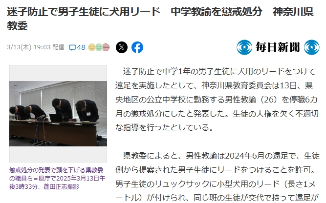 https://news.yahoo.co.jp/articles/2fb4d283d4b751c7e033aaf24807c561ac97ddad迷子防止で中学1年の男子生徒に犬用のリードをつけて遠足を実施したとして、神奈川県教育委員会は13日、県央地区の公立中学校に勤務する男性教諭(26)を停職6カ月の懲戒処分にしたと発表した。生徒の人権を欠く不適切な指導を行ったとしている。県教委によると、男性教諭は2024年6月の遠足で、生徒側から提案された男子生徒にリードをつけることを許可。男子生徒のリュックサックに小型犬用のリード(長さ1メートル)が付けられ、同じ班の生徒が交代で持って遠足が行われた。男子生徒は過去に迷子になったことがあった。遠足後に「リードは嫌だった」と話していたという。