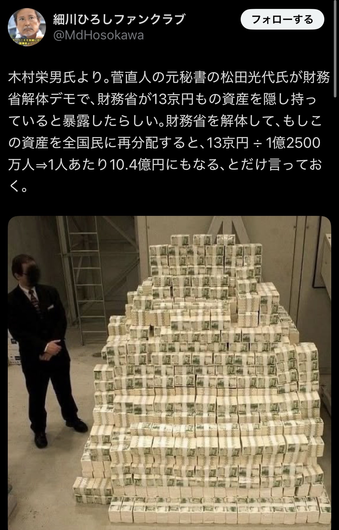 財務省の簿外資産は13京円、財務省を解体すると国民1人あたり10億円が振り込まれ日本円は崩壊、OK?