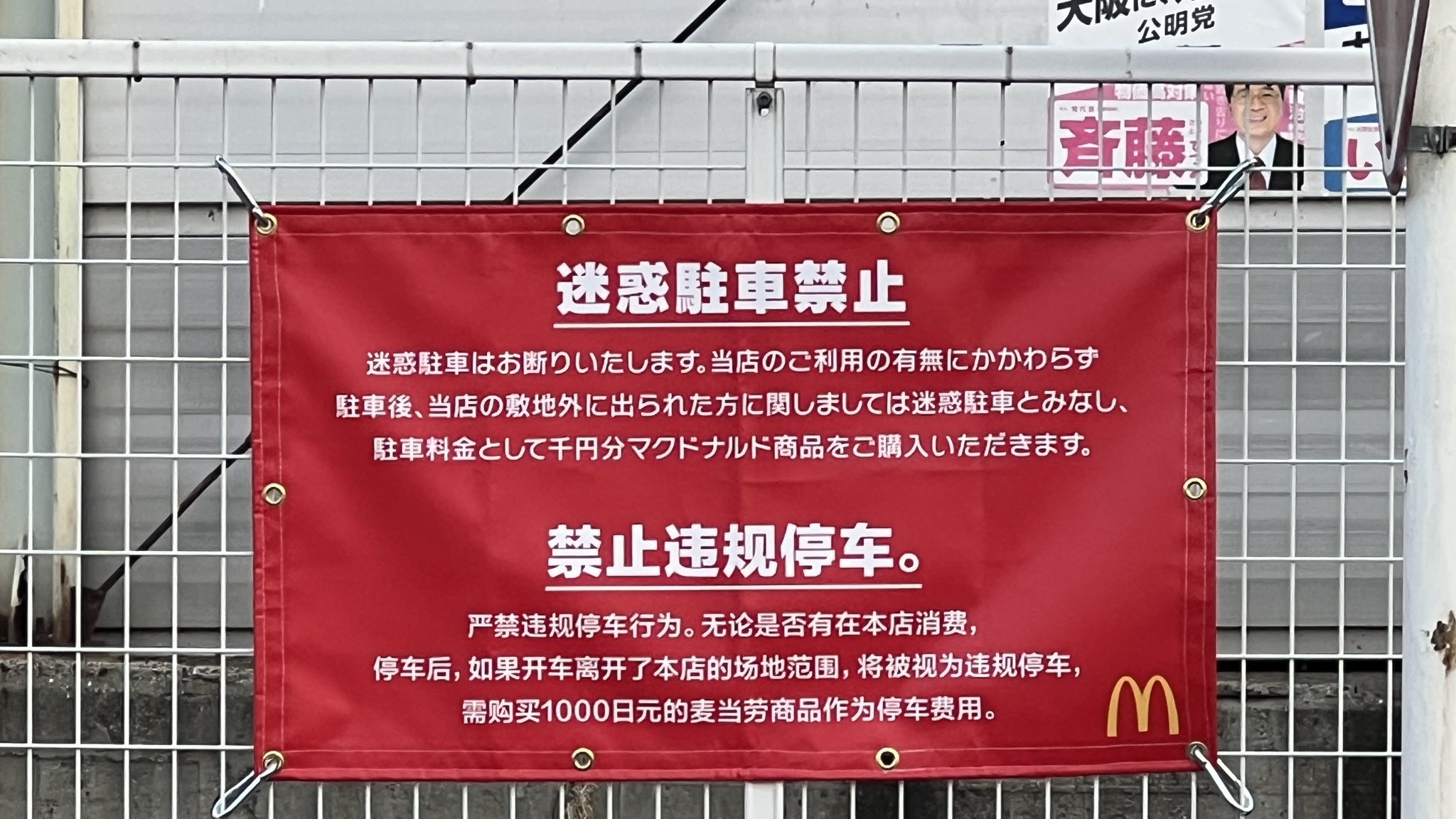 大阪鶴見で長年、中国人による迷惑無断駐車が横行するマクドナルドでお店側が中国語の警告を貼り、今後対策していかれるそうです