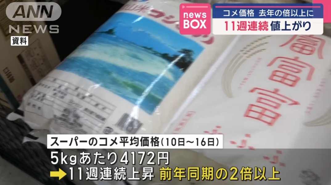 コメの値上がりが止まりません。スーパーで販売されているコメの平均価格が11週連続で値上がりし、5キロあたり4172円となりました。