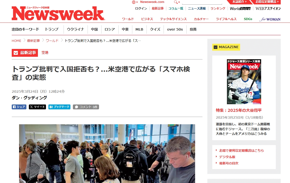 2025年3月24日、ニューズウィーク日本版に掲載された記事によると、アメリカの空港での入国審査が厳格化しており、スマートフォンの中身をチェックされるケースが増加していることが報じられています。