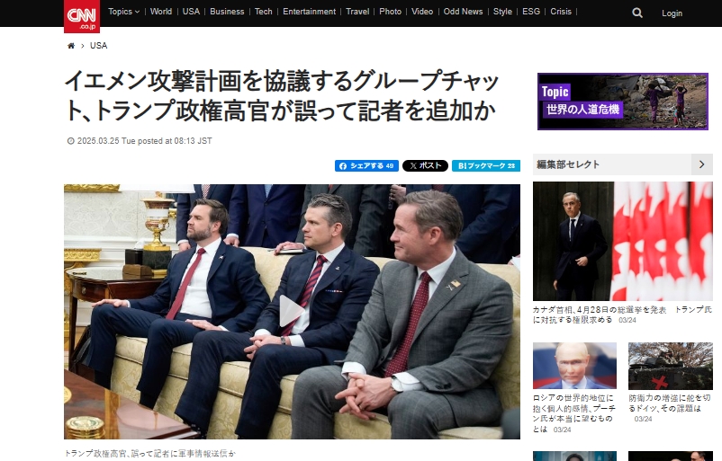 アトランティック誌によると、ウォルツ大統領補佐官(国家安全保障担当)は今月、紅海の海上輸送の脅威となっているイエメンの反政府組織フーシへの攻撃について協議するため、バンス副大統領やヘグセス国防長官、ルビオ国務長官を含む米政権高官とのグループチャットを開設した。ウォルツ氏はおそらく誤って、アトランティック誌のゴールドバーグ編集長をグループチャットに追加してしまったという。