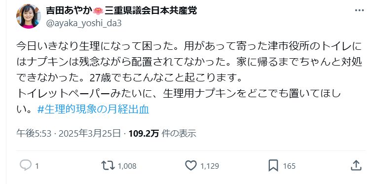 物議を醸したのは、25日の投稿。「今日いきなり生理になって困った。用があって寄った津市役所のトイレにはナプキンは残念ながら配置されてなかった。家に帰るまでちゃんと対処できなかった。27歳でもこんなこと起こります。トイレットペーパーみたいに、生理用ナプキンをどこでも置いてほしい」と訴えた。