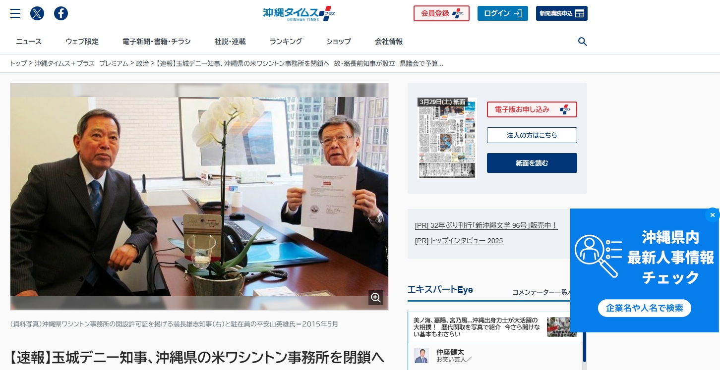 【速報】玉城デニー知事、沖縄県の米ワシントン事務所を閉鎖へ