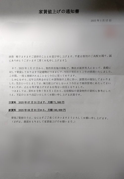 そしてこれまでの家賃7万1500円から、実に3倍に近い「19万円に値上げする」と通知してきたのだ。通知書には以下のようなことが書いてあった。