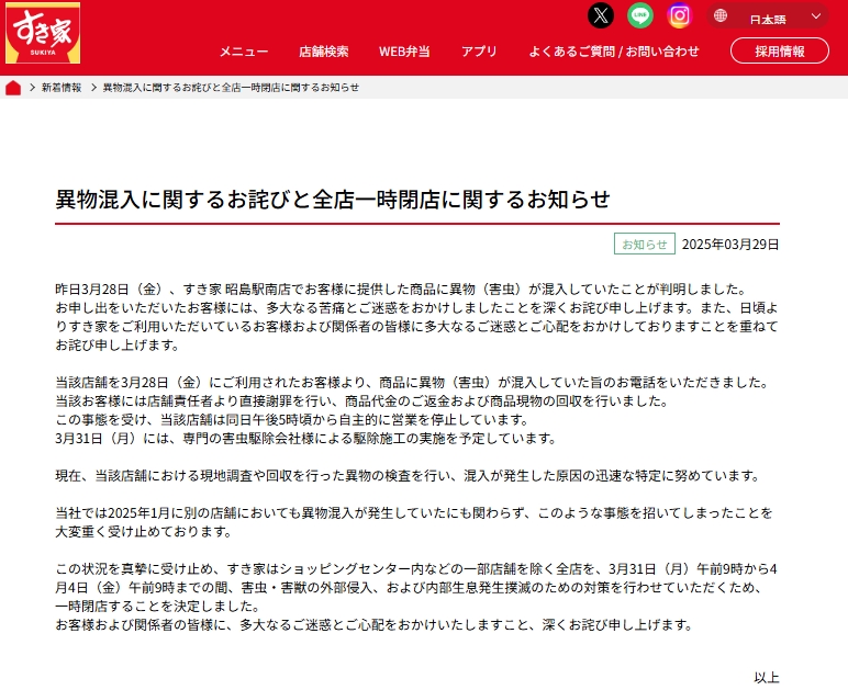 牛丼チェーン「すき家」は29 日、公式サイトを更新。きのう28日、昭島駅南店で提供した商品に異物(害虫)が混入していたことを発表。謝罪するとともに、ショッピングセンター内などの一部店舗を除く全店を一時閉店とすることも発表した。