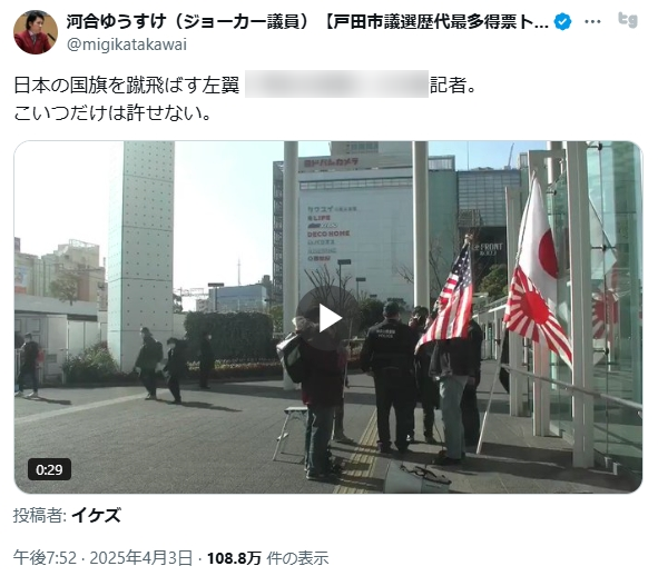 【動画】某新聞の記者、偶然を装い「日本の国旗を蹴飛ばす」も定点カメラで故意の証拠がばっちり映る