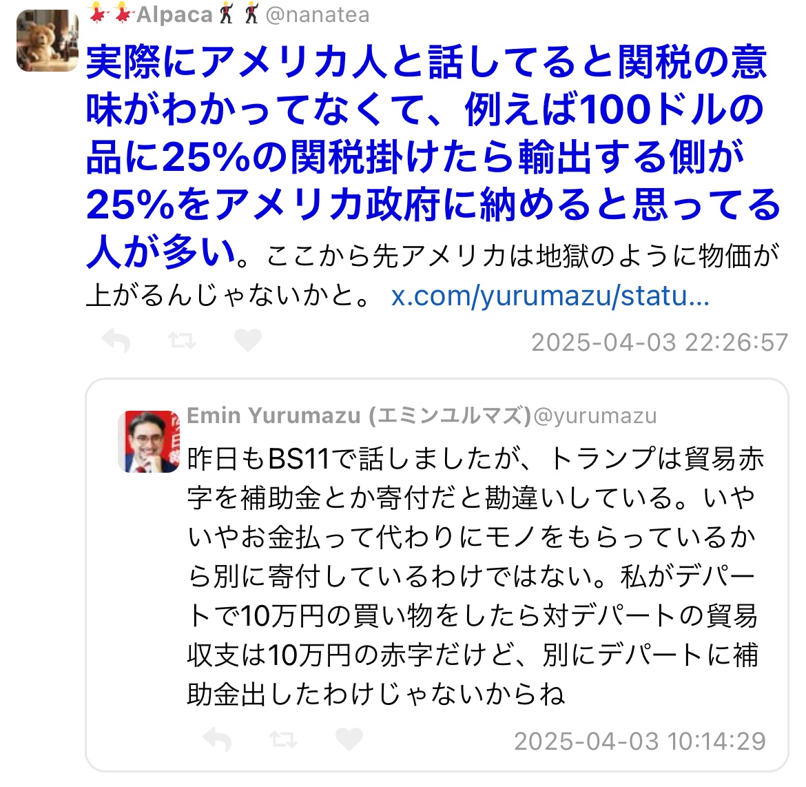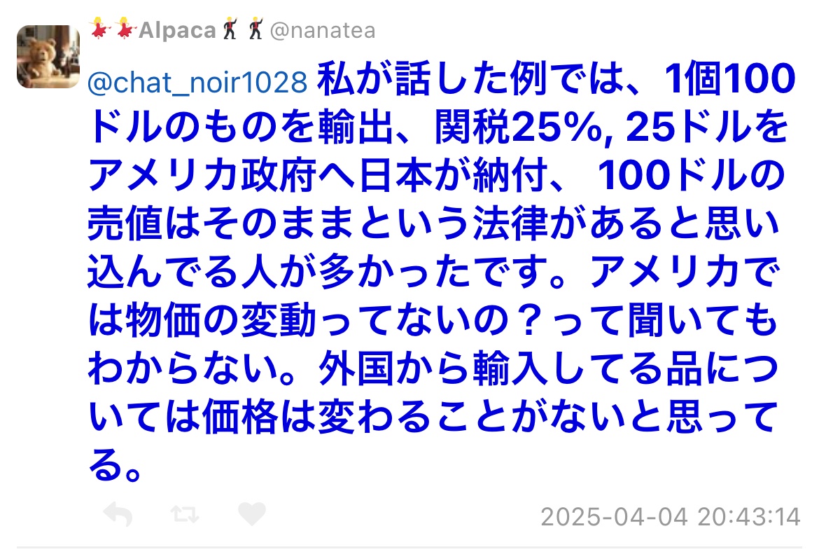 【悲報】アメリカ人「関税なら知ってるよ。日本人がアメリカ政府に25%納めるんだろ?」