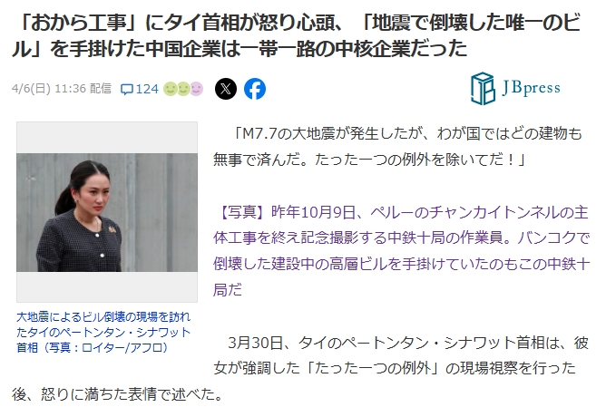 ■ミャンマーの被害は報道してもタイの「人災」には触れない中国メディア中国でも、ミャンマーで大地震が発生したことは、連日伝えている。隣国で起こった「天災」だけに、マンダレーに取材チームを派遣したりして、むしろ日本での報道よりも多いくらいだ。