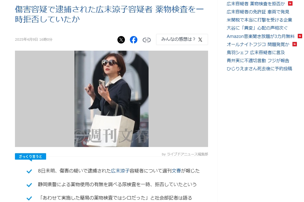 【速報】女優・広末涼子(44)薬物検査拒否が報じられる