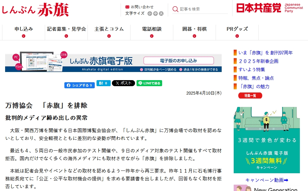 【速報】日本国際博覧会協会、しんぶん赤旗の取材禁止で排除へ
