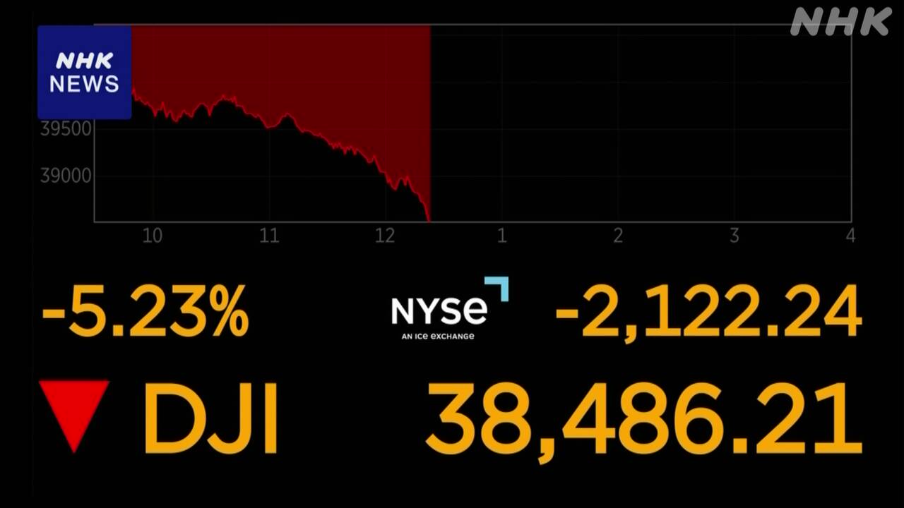 10日のニューヨーク株式市場では、ダウ平均株価が一時、9日と比べて2100ドルの値下がりとなっています。
