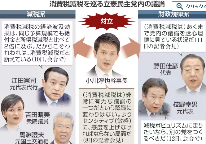 立憲民主党が消費税減税を巡り党内抗争を始めた。夏の参院選を見据え、有権者にわかりやすい経済政策として消費税減税を訴える減税派と、「責任政党」として減税に慎重な財政規律派が互いに主張をぶつけ合って一歩も譲らない。減税派に離党を要求する発言も飛び出し、消費税率引き上げを巡って分裂した民主党の〝亡霊〟にとり付かれたようだ。