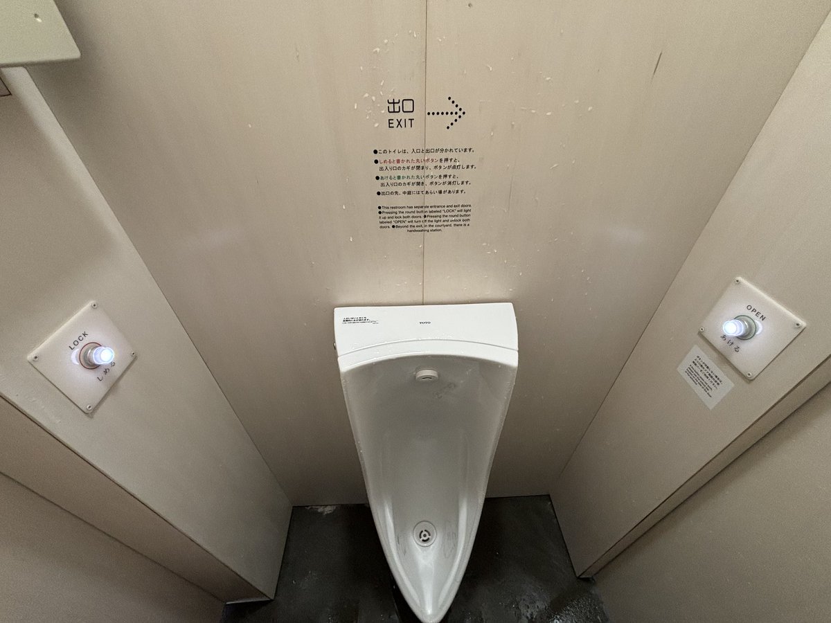 「公衆トイレとしてはかなり特殊な構造であるにもかかわらず、外側に説明書き等は一切ありませんでした。あるのはデザイナーの自己満足としか思えないパンチングのピクトグラムだけです(肉眼ではもっと見にくいです)。小便のために5分以上並んでいたと思いますが、その間に何となく仕組みを理解しました。ただ、どうやってロックするのかは実際に個室内に入って初めて分かりました。ロックしないまま用を足して出ていく人もいたので、その場合次の人は頃合いを見てドアを開けて様子を見るしかありません」