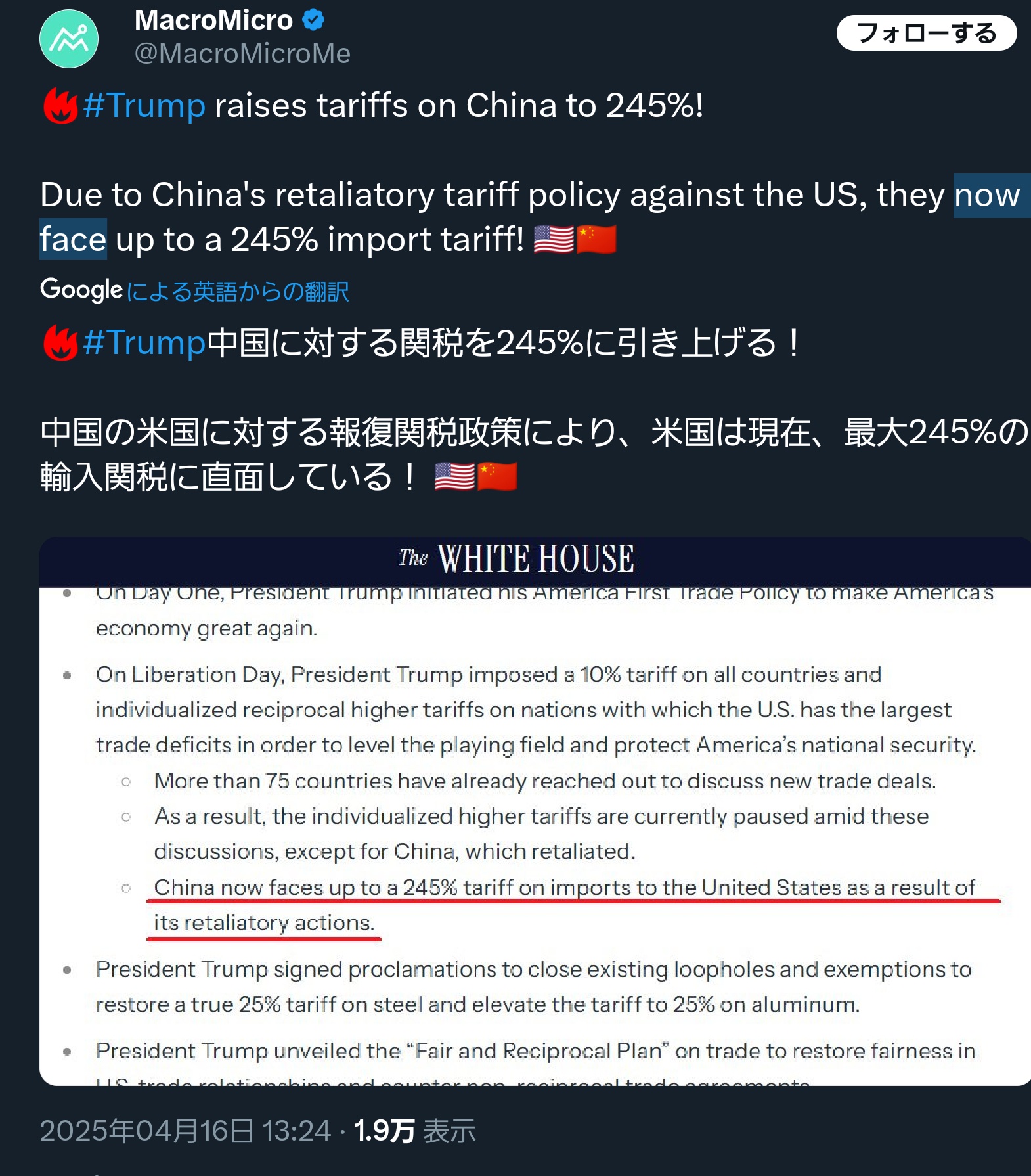 【速報】対中関税、最大245%に引き上げ ホワイトハウス発表