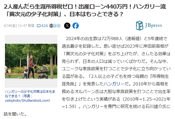 ハンガリー「本物の異次元の少子化対策見せてやらぁ!」2人産んだら生涯所得税ゼロ!無利子の出産ローン440万円!住宅購入補助!家族手当!