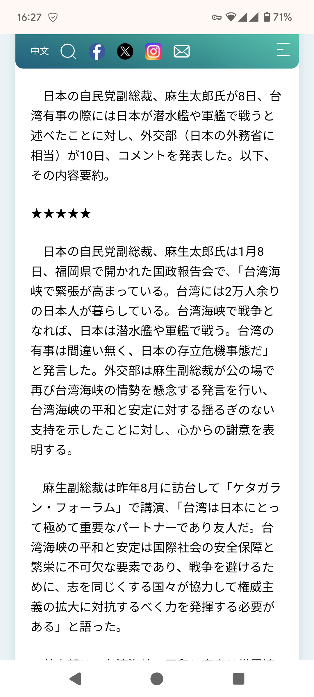1: 名無し 2025/04/19(土) 17:02:15.97 ID:Y+dRcN3j0 BE:271912485-2BP(1500)日本の自民党副総裁、麻生太郎氏は1月8日、福岡県で開かれた国政報告会で、「台湾海峡で緊張が高まっている。台湾には2万人余りの日本人が暮らしている。台湾海峡で戦争となれば、日本は潜水艦や軍艦で戦う。台湾の有事は間違い無く、日本の存立危機事態だ」と発言した。