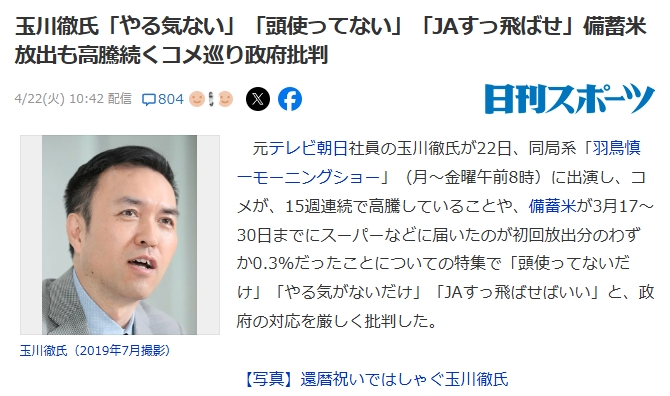 小売店へ流通したのは初回放出分の0・3%であること、農水省の報告によると備蓄米は政府→集荷業者→卸売業者→小売店を経て消費者の手に届くことも紹介した。これに元テレビ朝日社員でコメンテーターの玉川徹氏は「集荷業者というのはイコールJA(農業協同組合)なんでしょ? そこをすっ飛ばせばいいんじゃないかと思う」と発言。