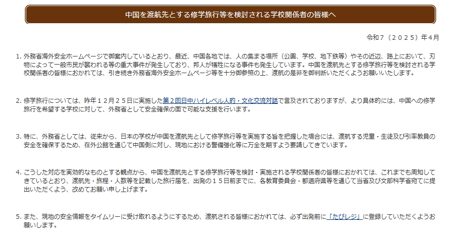 【速報】中国へ修学旅行で日本の外務省が注意喚起https://t.co/ZUVawLseFA