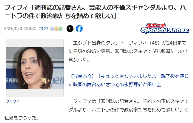 フィフィ「週刊誌の記者さん、芸能人の不倫スキャンダルより、ハニトラの件で政治家たちを詰めて欲しい」エジプト出身のタレント、フィフィ(48)が24日までに自身のSNSを更新。週刊誌のスキャンダル報道について言及した。