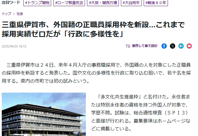 【速報】三重県伊賀市、時代の流れ読み間違える 外国籍の正職員採用枠を新設「行政に多様性を」