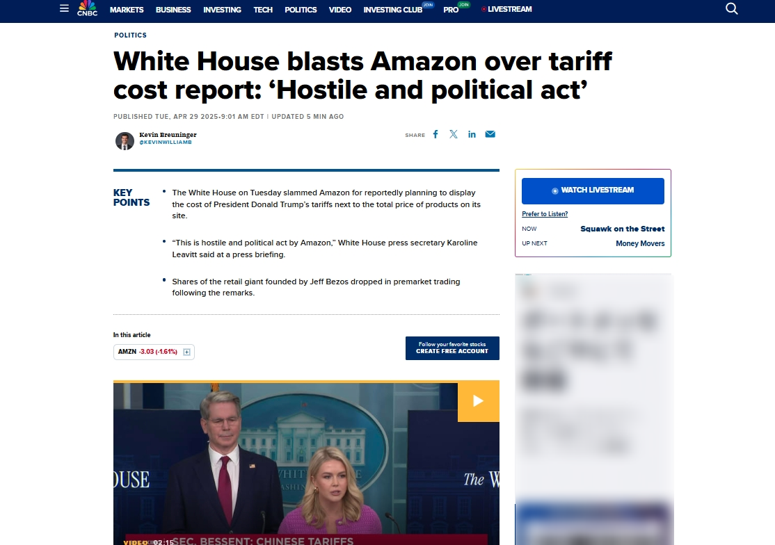 【朗報】Amazon「商品にトランプ関税のコストを表示します」→米国政府ブチ切れ会見「これは敵対的かつ政治的な行為だ」