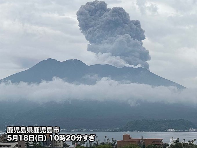気象台の降灰予報によりますと、噴煙は東の方向に流れ、18日午前1時までに▽鹿児島市の桜島島内では灰が降っているのが明らかに分かる程度の「やや多量」の降灰、▽鹿屋市、垂水市、曽於市、霧島市、志布志市、大崎町、それに宮崎県の日南市と串間市では、地面にうっすら積もる程度の「少量」の降灰がそれぞれ予想され、気象台が注意を呼びかけています