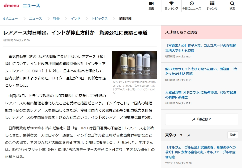 レアアース対日輸出、インドが停止方針か 資源公社に要請と報道 https://topics.smt.docomo.ne.jp/article/asahi/nation/AST6G24HHT6GUHBI01BM■応援クリック感謝
