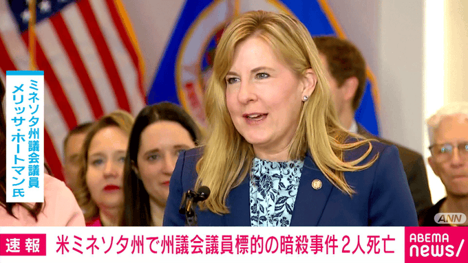 アメリカ中西部ミネソタ州で、民主党系の州議会議員と夫が銃で撃たれ、死亡しました。州内の別の場所でも、民主党系の州議会議員が銃撃されています。地元当局などによりますと、ミネソタ州ミネアポリスの郊外で14日早朝、州議会の民主党系の議員とその夫が自宅で何者かに銃で撃たれ、死亡しました。