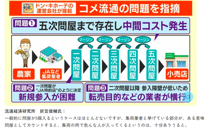 関西地方で卸業者を営む男性は、小泉氏が主張する“五次問屋”発言について違和感を口にする。「テレビでよく五次問屋と言われていますが、ピンと来ません。そもそも、はっきり階層があって『ここが五次問屋』というのが決まっているわけではない。顧客への安定供給責任を果たす上で、卸同士の横のつながりで、売買があるだけ。例えばうちでコシヒカリが不足していたら、別の問屋からうちに卸してもらう。逆にその問屋から『ササニシキを卸してもらえないか』と注文があったりする」。