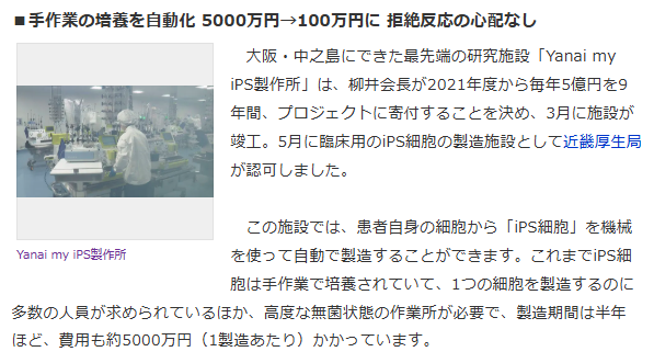 大阪・中之島にできた最先端の研究施設「Yanai my iPS製作所」は、柳井会長が45億円を寄付して完成しました。
