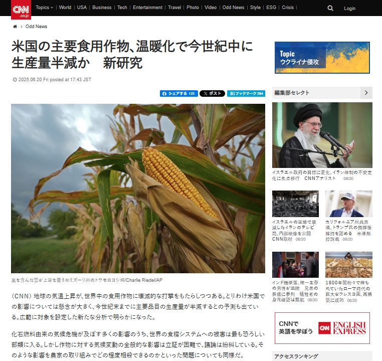 (CNN) 地球の気温上昇が、世界中の食用作物に壊滅的な打撃をもたらしつつある。とりわけ米国での影響については懸念が大きく、今世紀末までに主要品目の生産量が半減するとの予測も出ている。広範に対象を設定した新たな分析で明らかになった。化石燃料由来の気候危機が及ぼす多くの影響のうち、世界の食糧システムへの被害は最も恐ろしい部類に入る。しかし作物に対する気候変動の全般的な影響は立証が困難で、議論は紛糾している。そのような影響を農家の取り組みでどの程度相刹できるのかといった問題についても同様だ。
