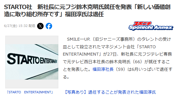 SMILE―UP.(旧ジャニーズ事務所)のタレントの受け皿として設立されたマネジメント会社「STARTO ENTERTAINMENT」が27日、新社長に元フジテレビ専務で元テレビ西日本社長の鈴木克明氏(66)が就任することを発表した。福田淳社長(59)は6月いっぱいで退任する。■応援クリック感謝