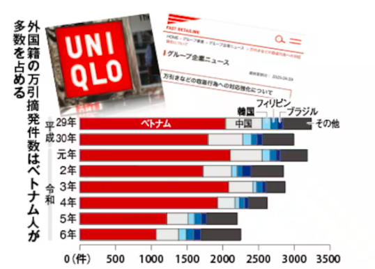 大阪市内のユニクロ店舗で衣料品を万引したなどとして、大阪府警が昨年逮捕したベトナム国籍の30~40代の女3人は、こう供述したという。