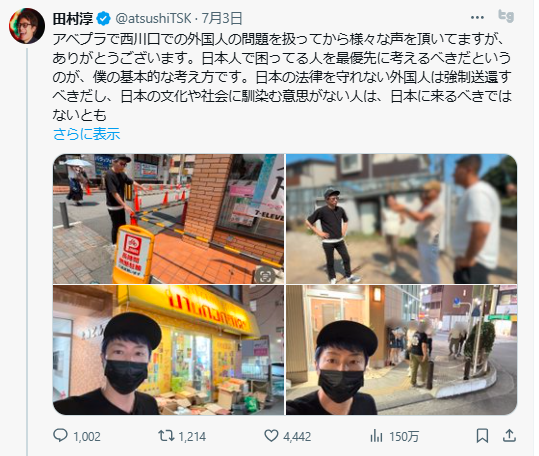 田村さんは埼玉・川口を取材し、その様子がABEMAで1日に『田村淳×川口クルド騒動 「生きていけない」仮放免者の実情とは』という番組で放送されました。「アベプラで西川口での外国人の問題を扱ってから様々な声を頂いてますが、ありがとうございます」と、多くの反響があったことを明かしています。