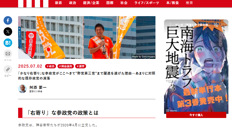 かなり右寄りである。これを、200万~300万人いると言われるネットの保守層、いわゆる“ネトウヨ”が支えた。その結果、同党は先の衆院選(比例代表)で187万347票を獲得し、3議席を得た。