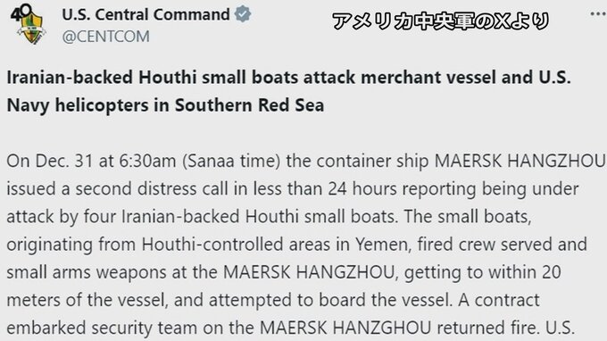 アメリカ中央軍によりますと、12月31日、紅海でシンガポール船籍のコンテナ船から「フーシ派の小型船4隻から攻撃を受けている」との救難信号が発信されました。
