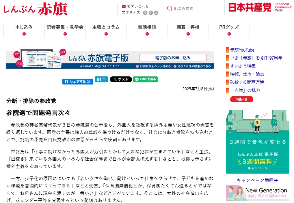共産党「参政党・神谷代表の問題発言をまとめました。皆さんどう思いますか」