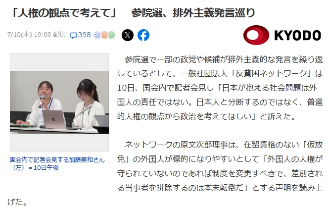参院選で一部の政党や候補が排外主義的な発言を繰り返しているとして、一般社団法人「反貧困ネットワーク」は10日、国会内で記者会見し「日本が抱える社会問題は外国人の責任ではない。日本人と分断するのではなく、普遍的人権の観点から政治を考えてほしい」と訴えた。ネットワークの原文次郎理事は、在留資格のない「仮放免」の外国人が標的になりやすいとして「外国人の人権が守られていないのであれば制度を変更すべきで、差別される当事者を排除するのは本末転倒だ」とする声明を読み上げた。